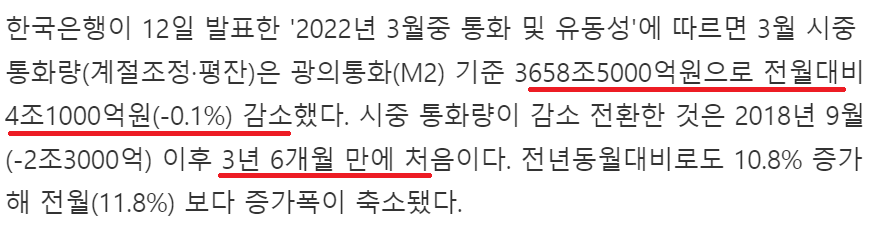 다시 정리하면 3월달의 시중통화량 M2 기준으로 4조 1000억원이 감소가 된것을 볼 수 있습니다.