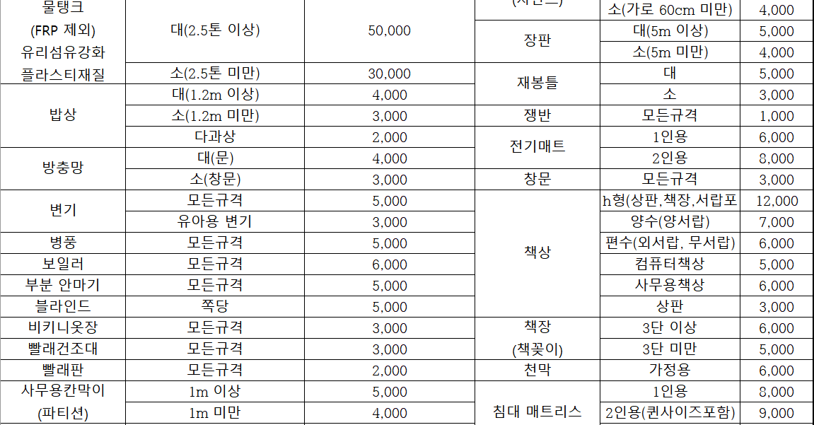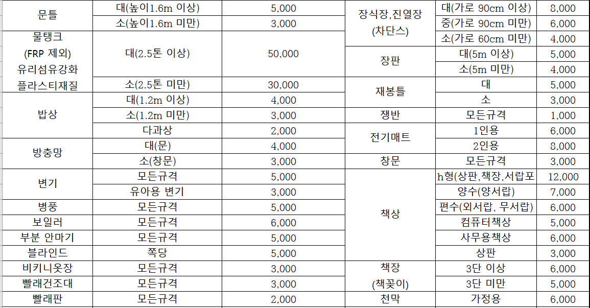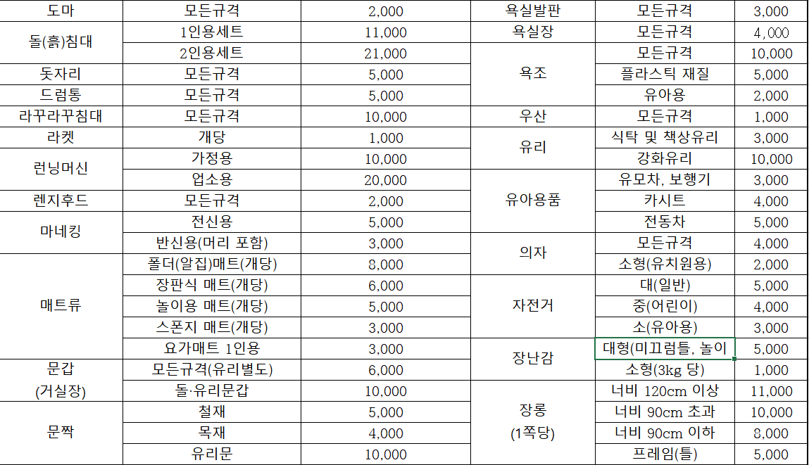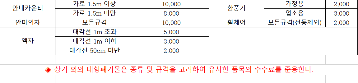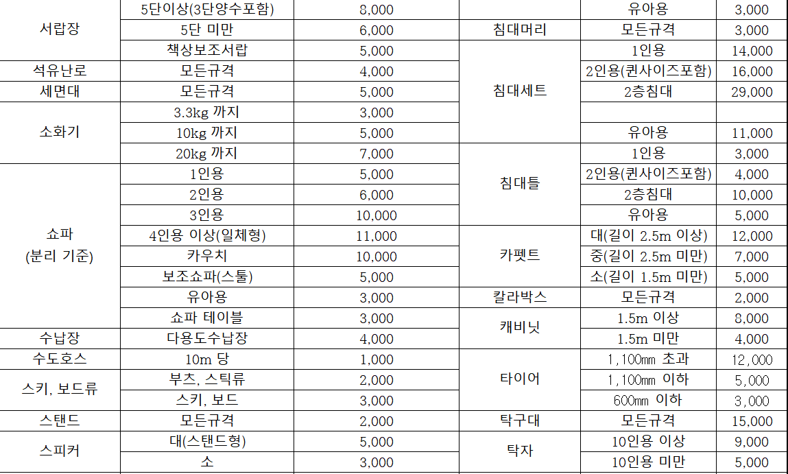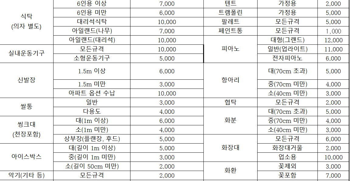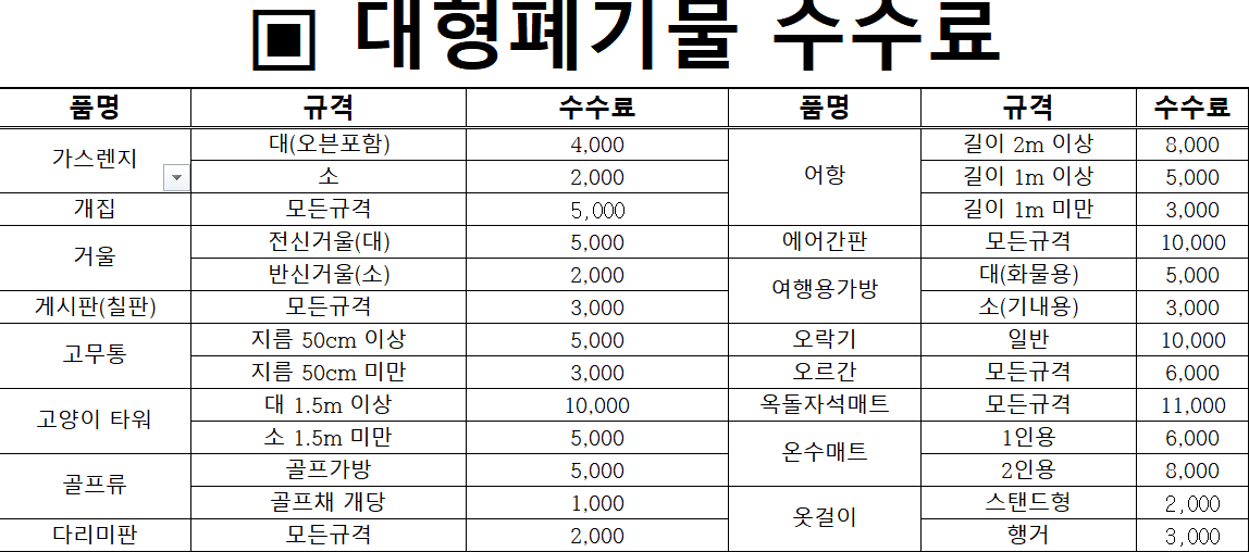 그렇다면 이제 가장 중요한 대형폐기물 수수료는 품목별로 얼마일까요?