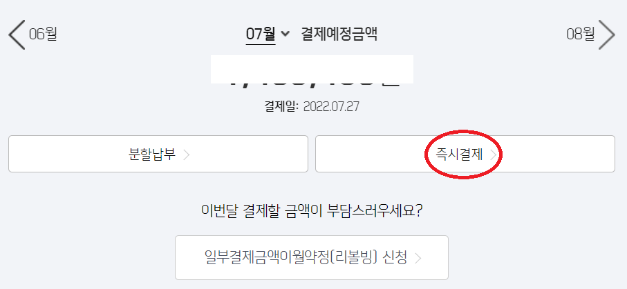 즉시결제는 이번달 모든 금액을 다 결제하지 않아도 됩니다.