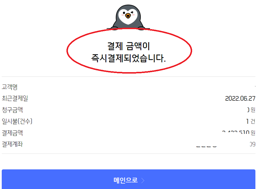 그리고 결제한 계좌등이 나오는 것을 확인 할 수 있습니다.