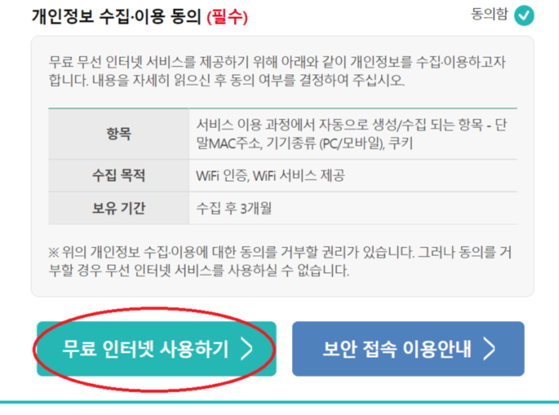 그리고, 아래에 '무료 인터넷 사용하기'를 눌러주세요.