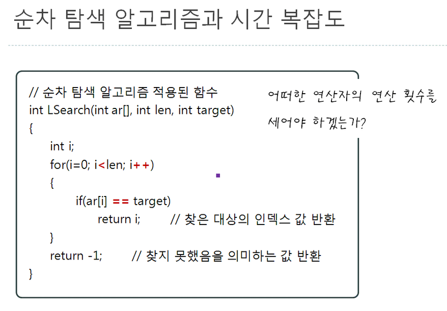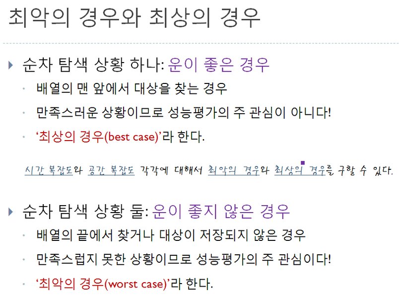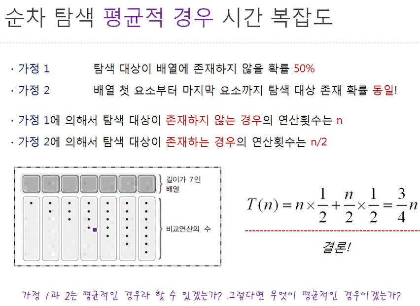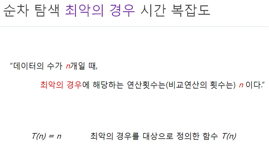 따라서 순차 탐색의 최악의 경우 시간 복잡도는 T(n) = n 입니다.