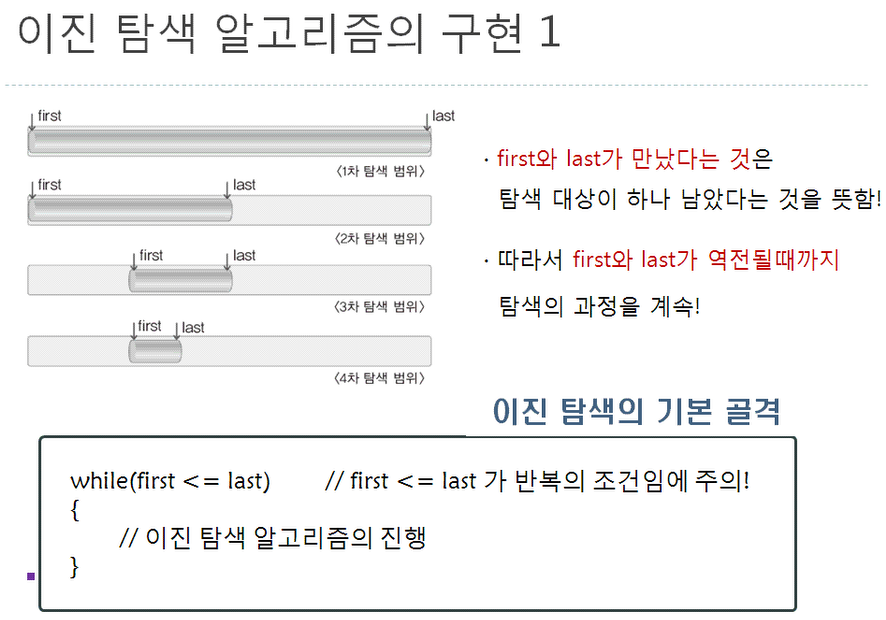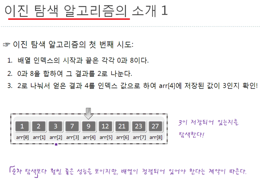 이진 탐색 알고리즘의 전제는 배열이 정렬되어 있어야 한다는 점입니다.
