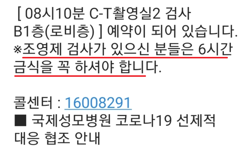 그리고 조영제 검사가 있는 사람은 꼭 6시간 금식을 해야한다는 문자를 받고