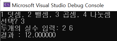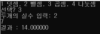 printf("1 덧셈, 2 뺄셈, 3 곱셈, 4 나눗셈 \n");