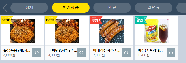 인기상품, 밥류, 라면류, 음료류, 과자류, 기타
