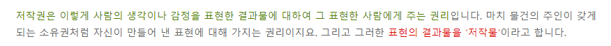저작권은 생각이나 감정을 표현한 결과물을 그것을 만들어낸 사람에게 주는 권리입니다.