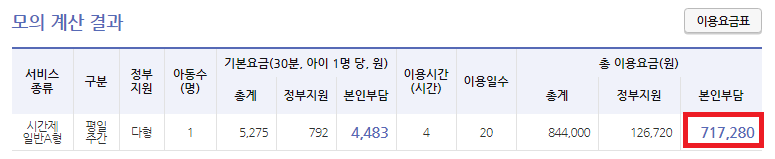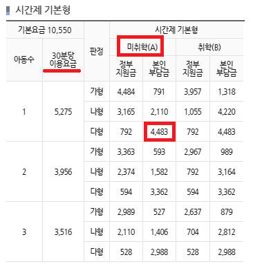 아래와 같이 미취학 아동 1명에 다하여 '다형'의 경우 30분 이용시 본인 부담금은 4,483원입니다.
