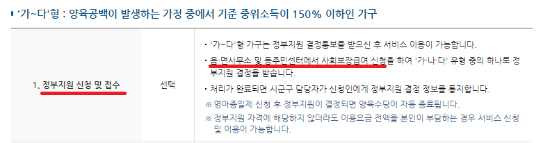 제일먼저 아래와 같이 동주민센터에서 '가~다' 유형 중의 하나로 정부지원 결정을 받아야 합니다.