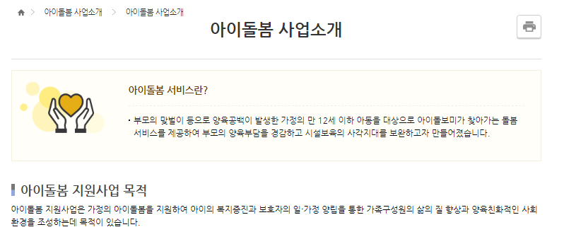만 12세 이하의 아이들에게 정부에서 제공하는 돌봄 서비스 입니다.