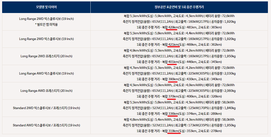 위에서 Long Range 2WD 등급의 복합연비가 5.1km/kWh 라는 것을 확인 할 수 있습니다.