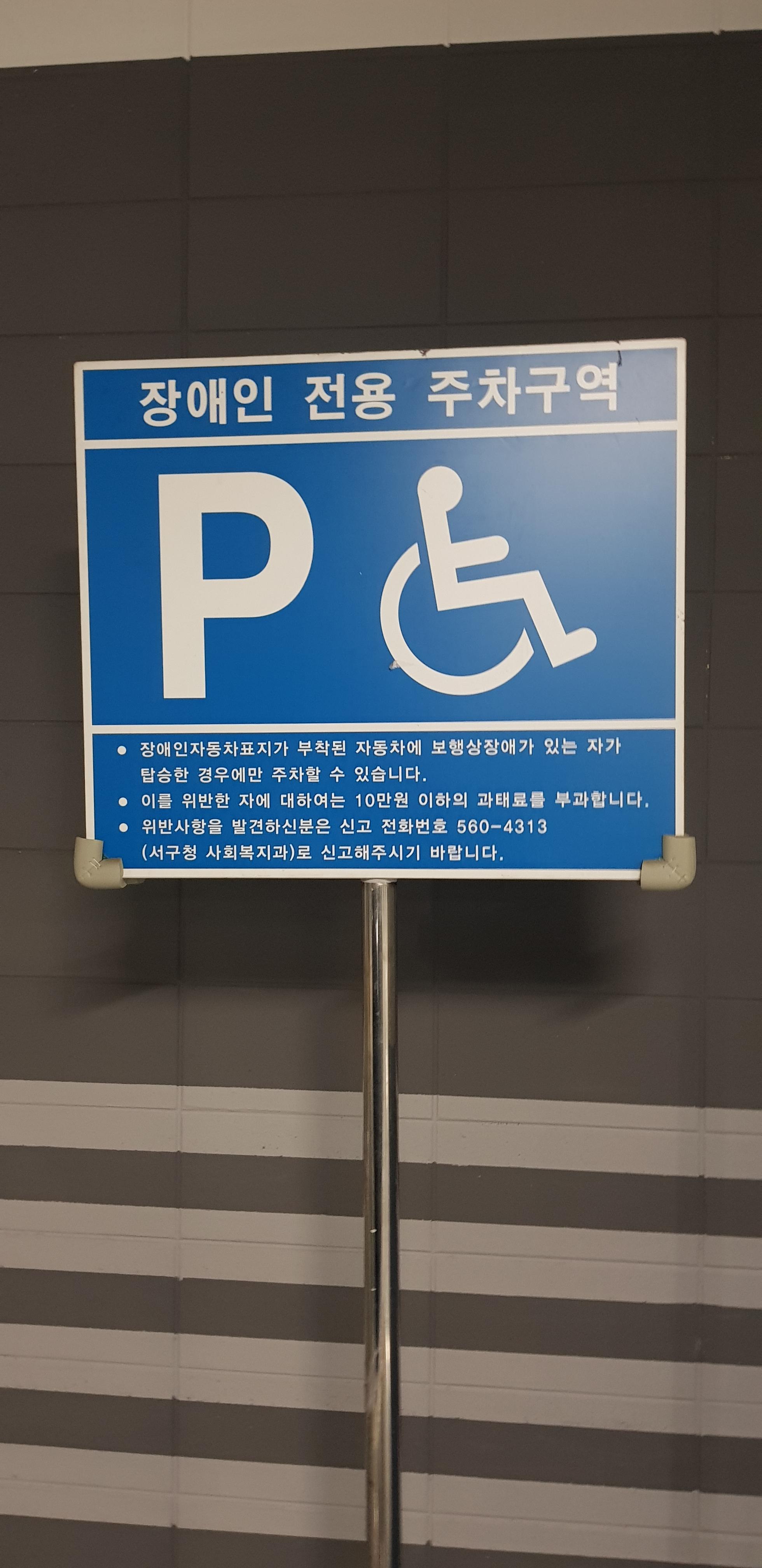 아래는 인천서구의 장애인 전용 주차구역 팻말을 찍은 사진입니다.
