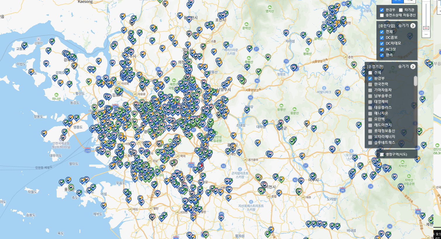 그러면 아래와 같이 우리나라의 전기차 충전소 현황이 나오고 있는것을 확인 할 수 있습니다.