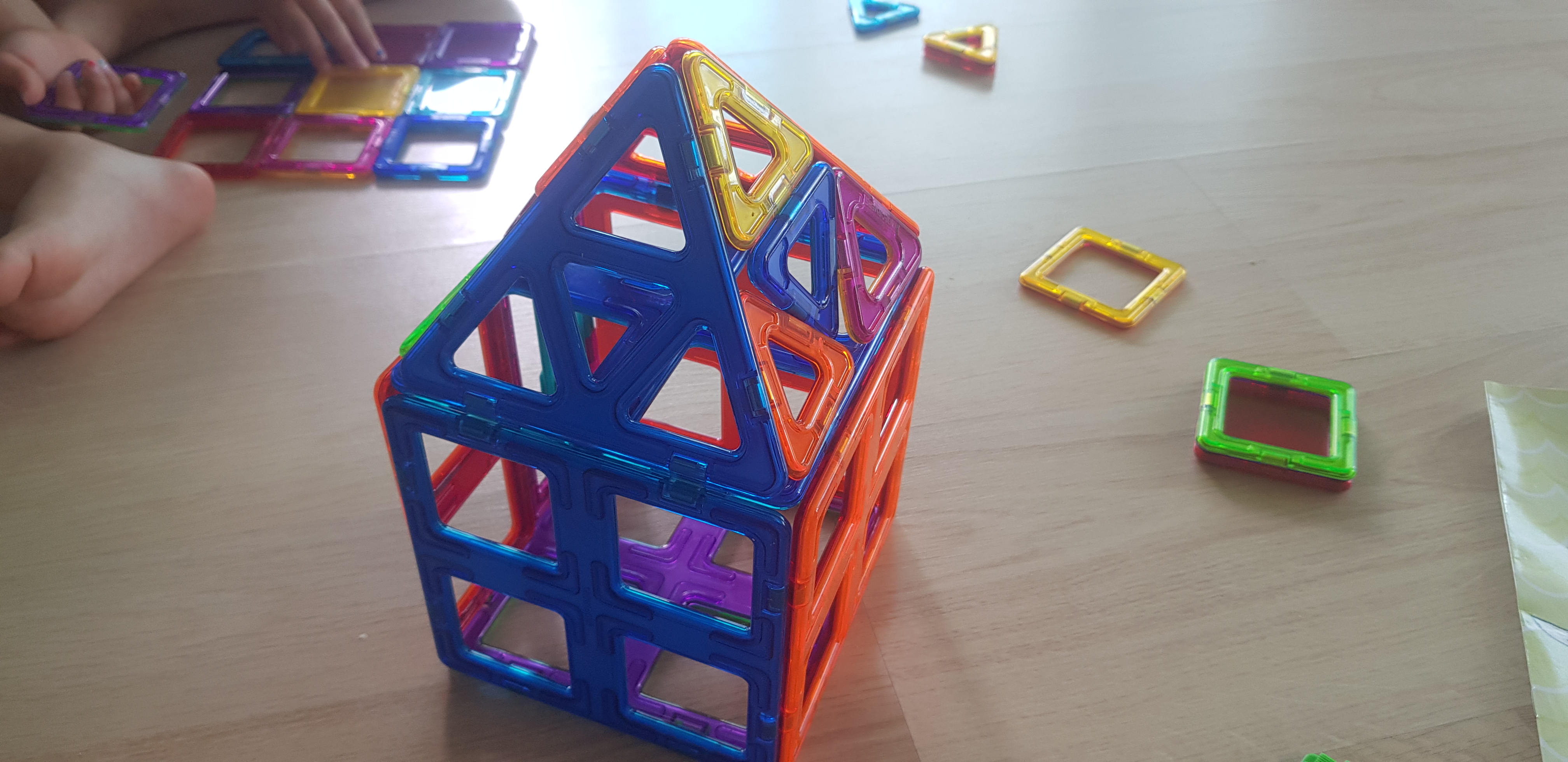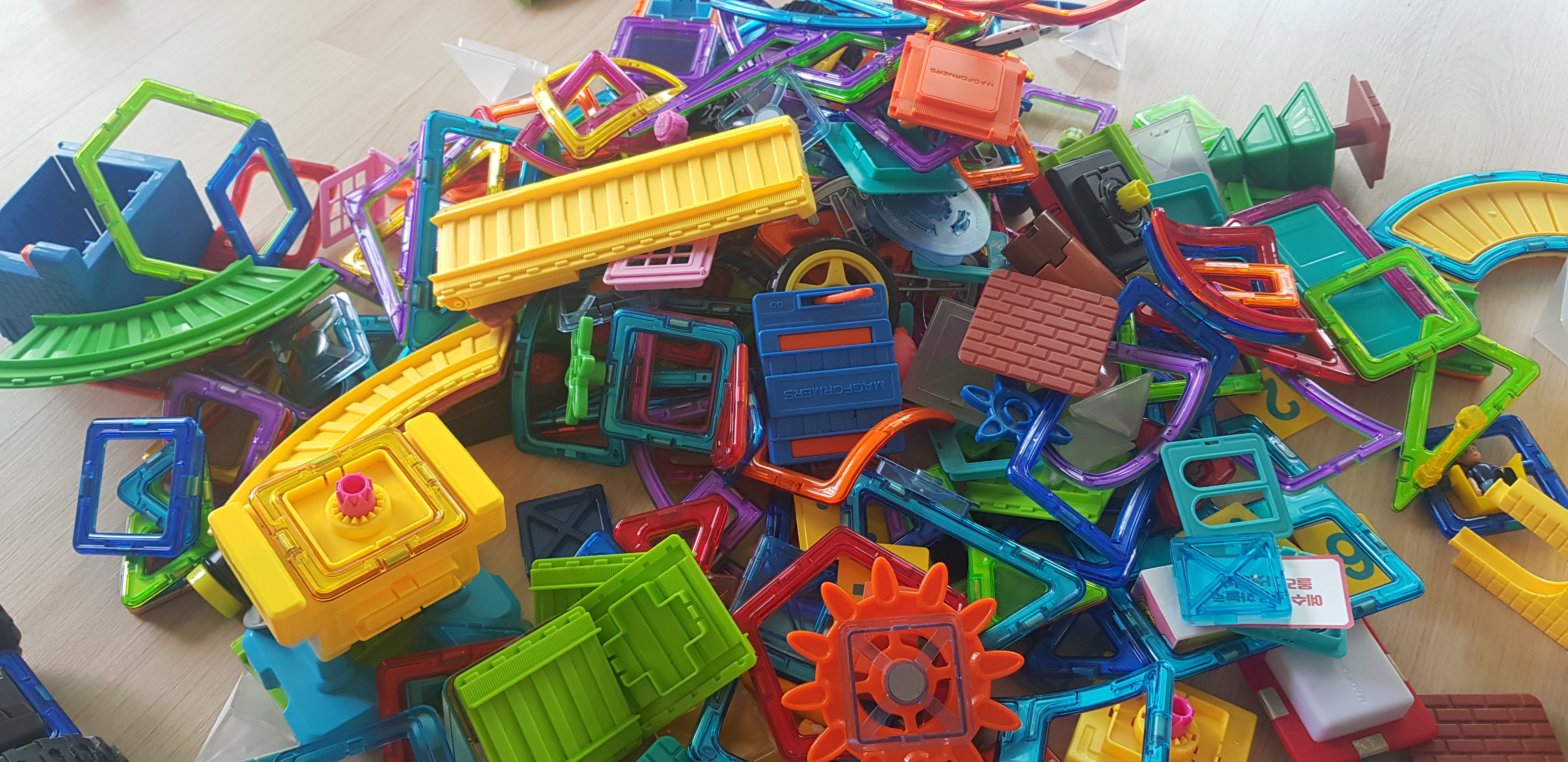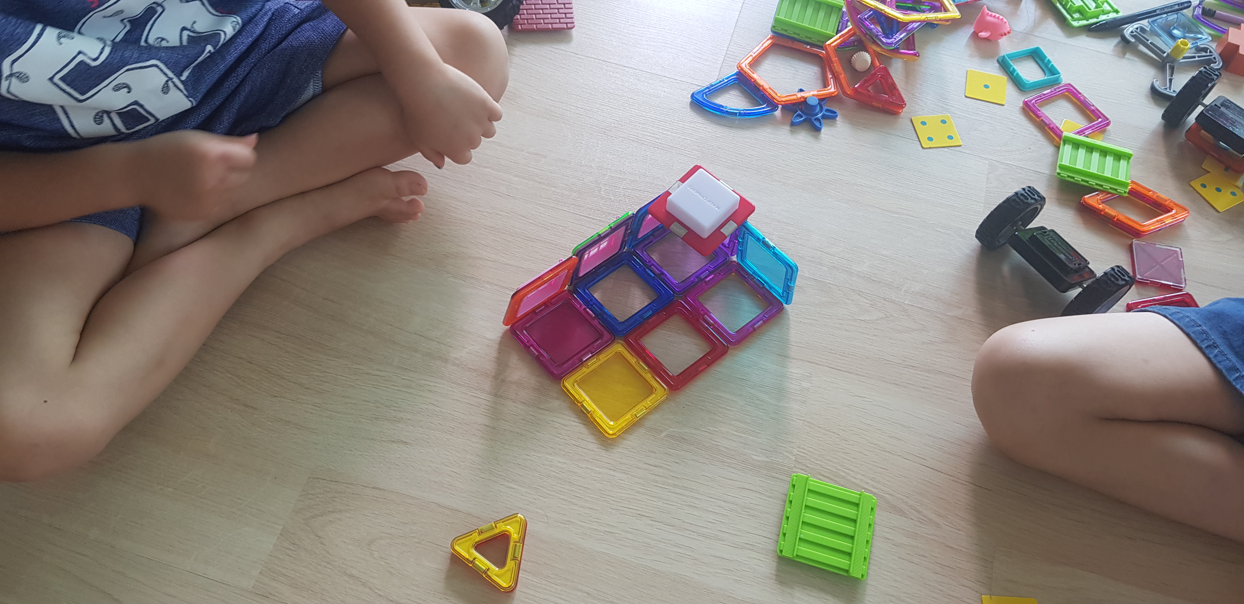 아이들과 함께 놀기 위해 맥포머스를 바닥에 쏟았습니다.