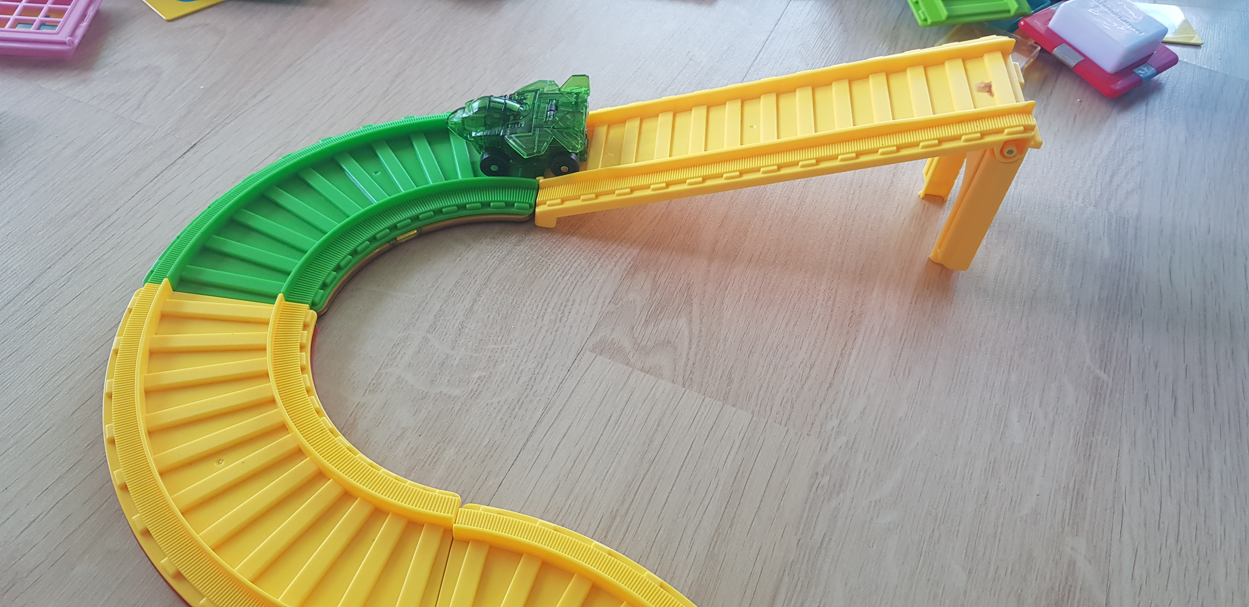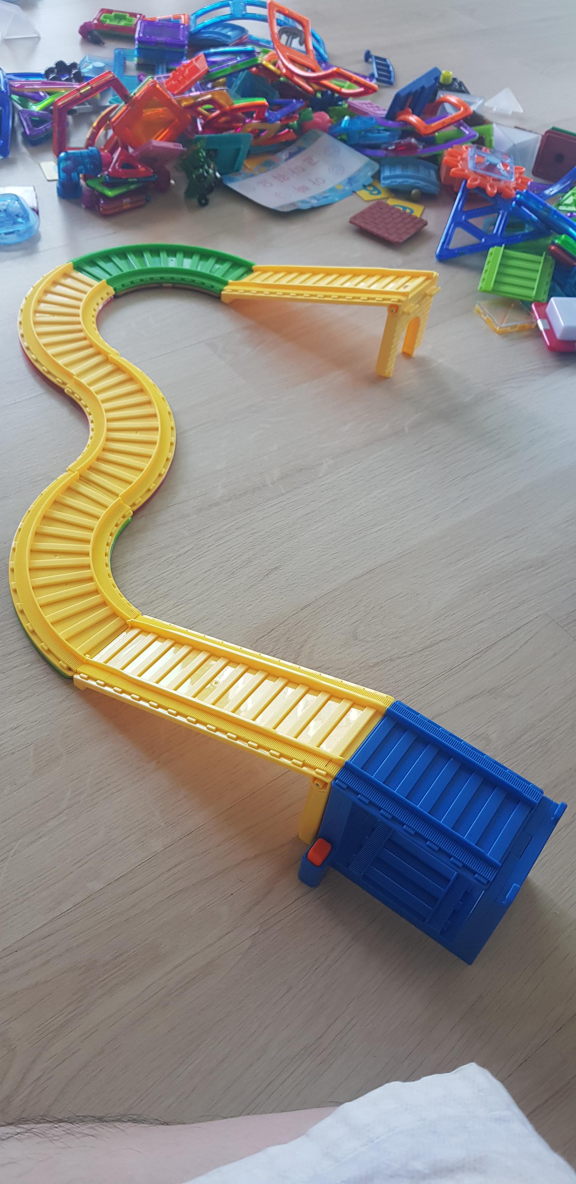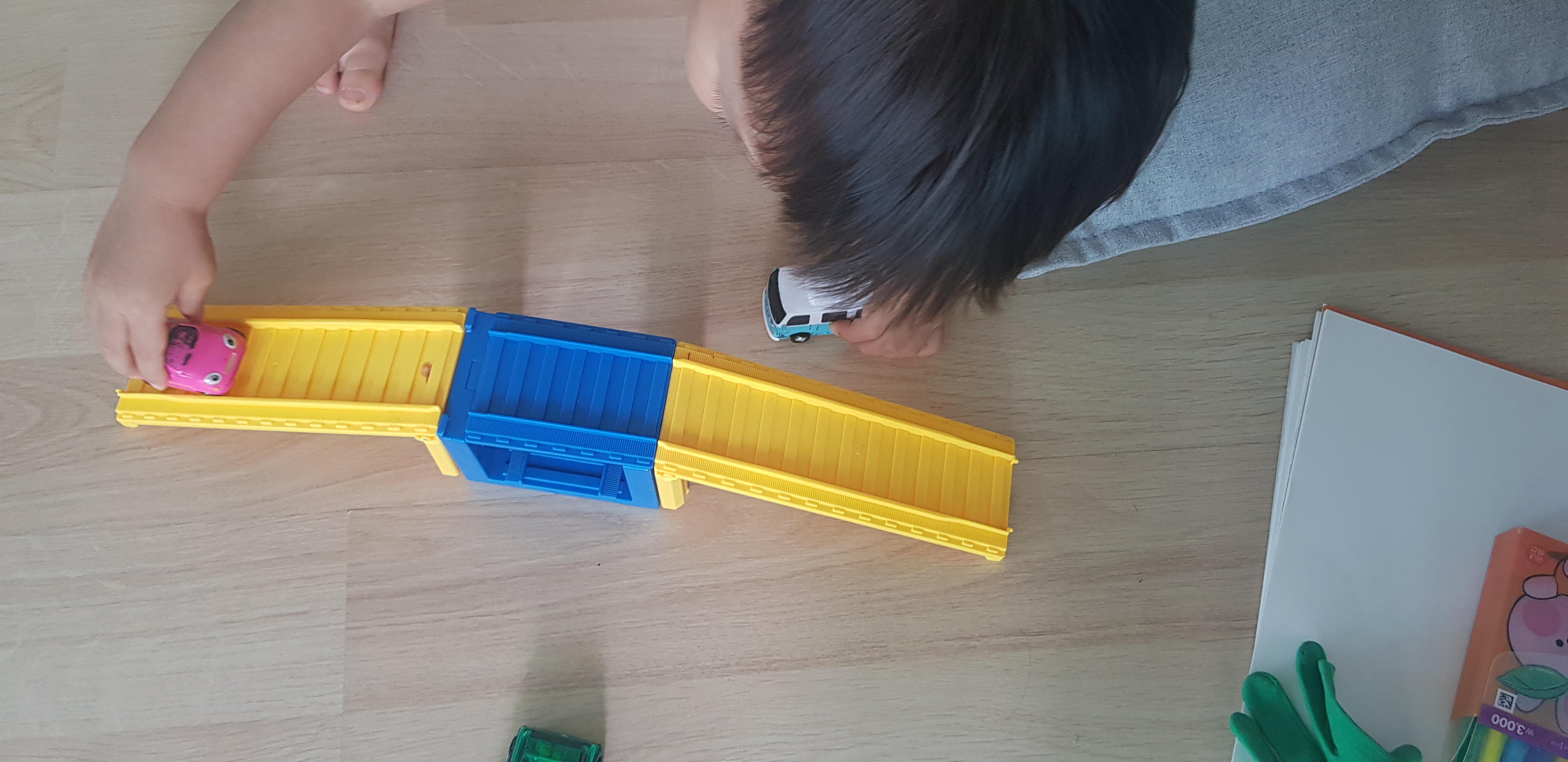 3째가 이렇게 기차길을 만들어서 자동차를 올려서 놀고 있습니다.