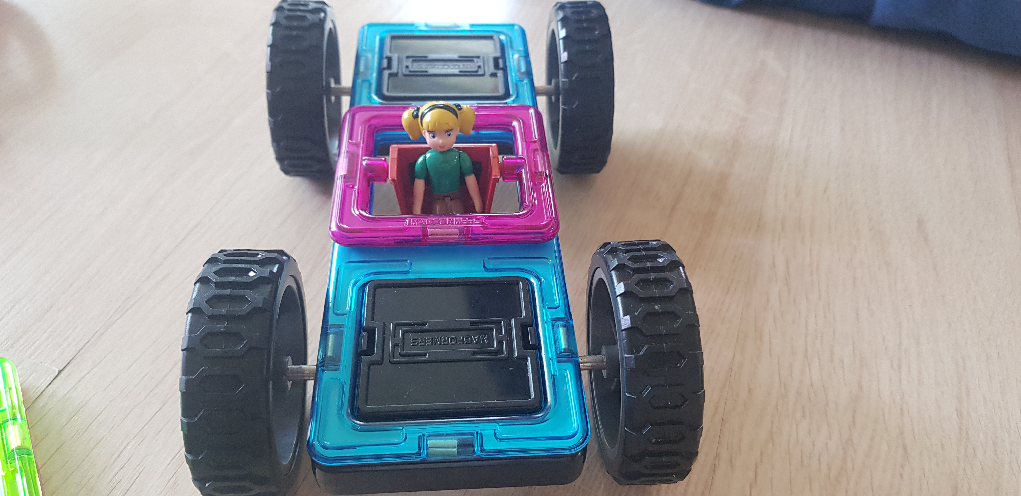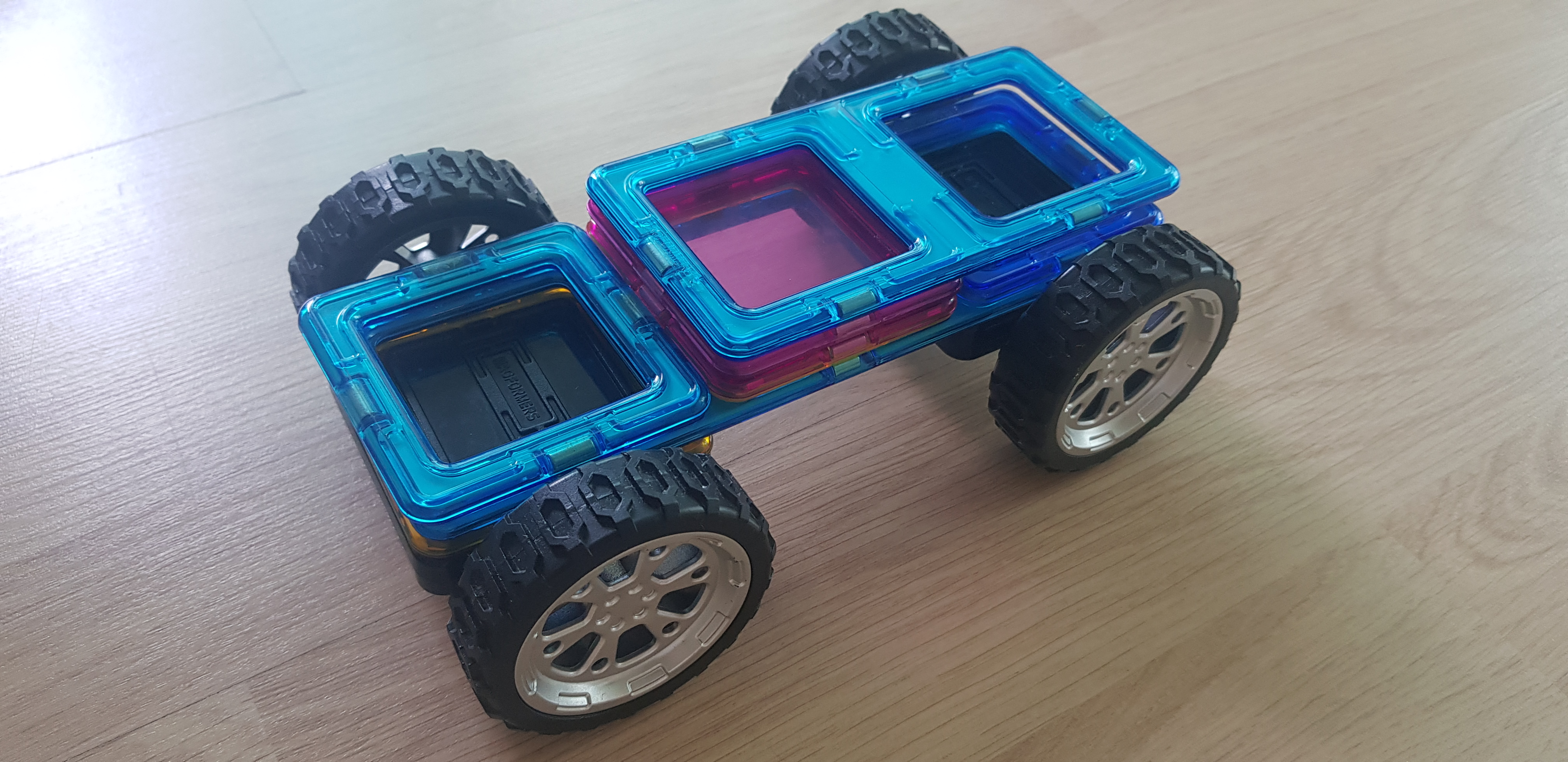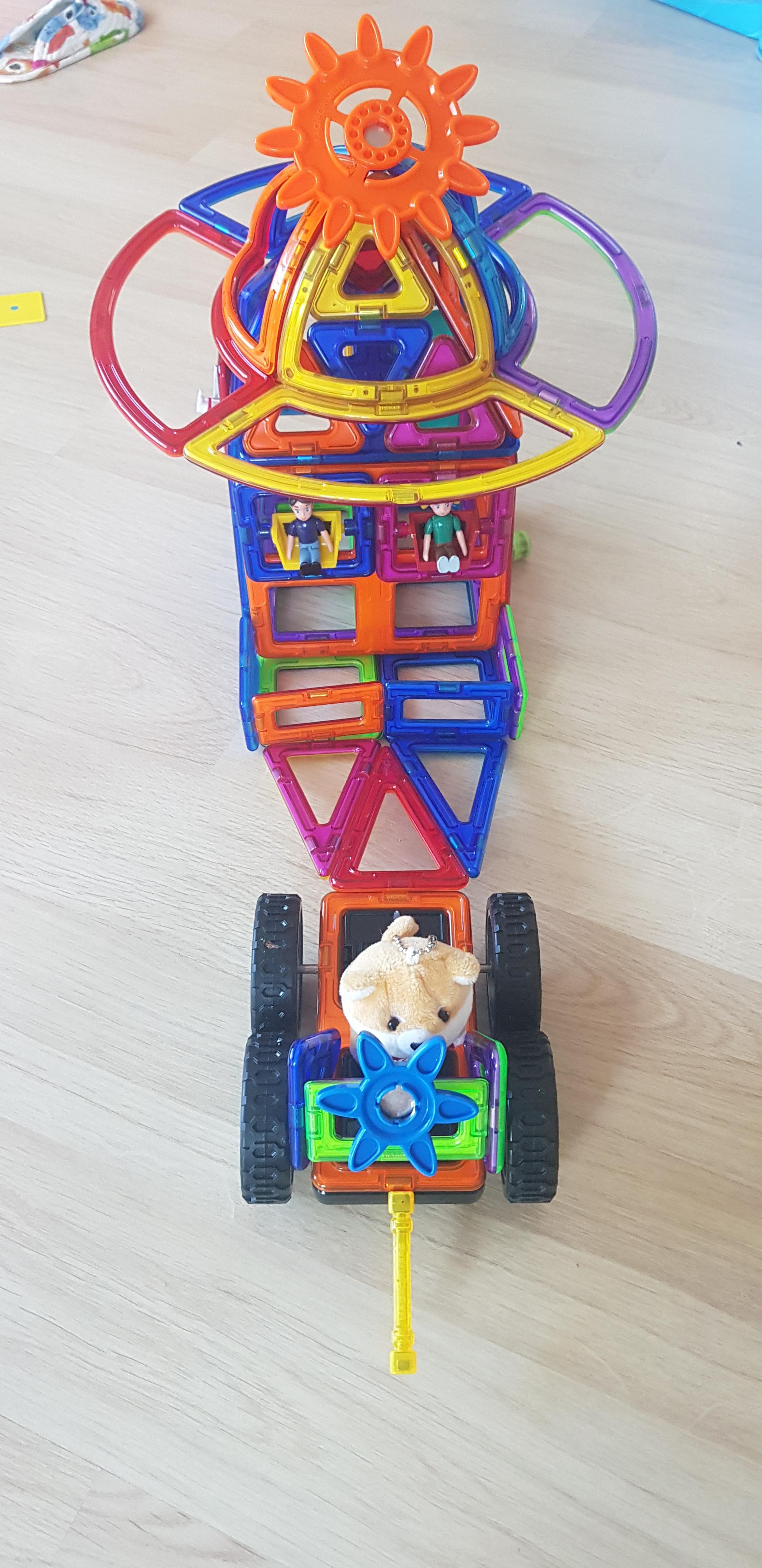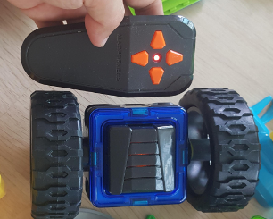 요렇게 바퀴를 연결하고 위에 자석블럭을 쌓아서 놀곤 합니다.