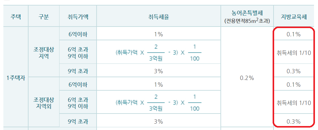 하지만 취득세의 경우 아래와 같이 취득당시, 주택수 및 아파트 가격에 따라서 지방교육세 비율이 달라지게 됩니다.