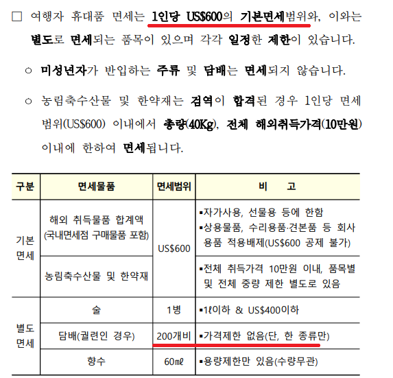 참고로 여행중 아래와 같이 담배는 200개피 한종류에 대해서 별도 면세입니다.