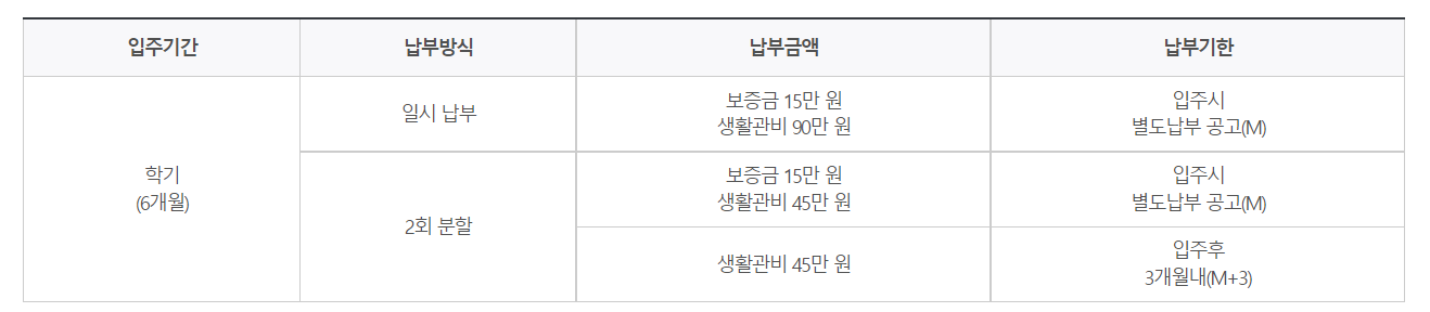 우선 처음 입주를 할 경우 보증금 15만원을 넣으시고, 나중에 퇴실하실때 받아가시며 됩니다.