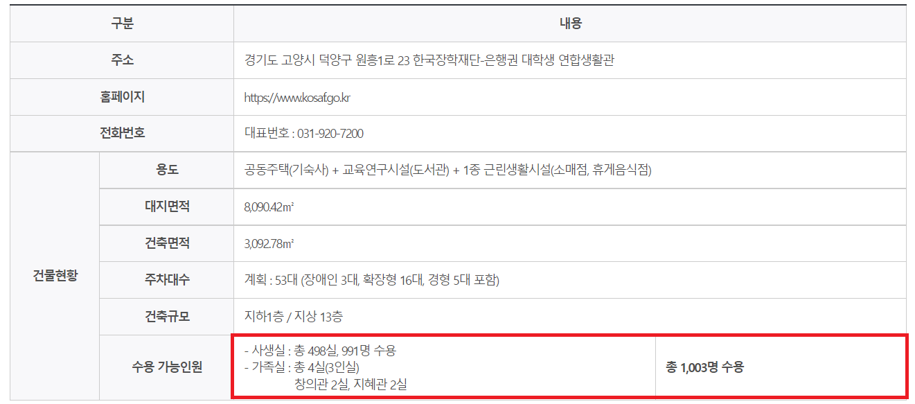 1. 한국장학재단 대학생 연합생활관 시설 요약정리