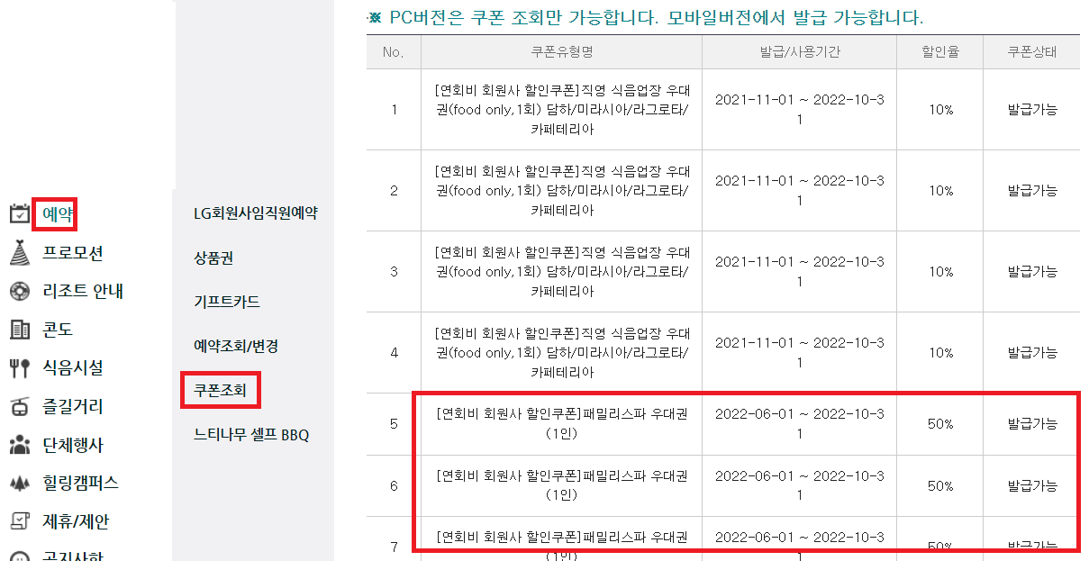 예약 쿠폰 조회를 하면 쿠폰조회가 나옵니다.
