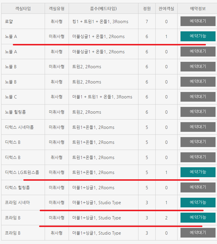 방은 프라임, 디럭스, 노블, 로얄 중 선택이 가능합니다.