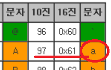 이것을 아스키 코드로 보면 a 라는 것을 알수 있다.