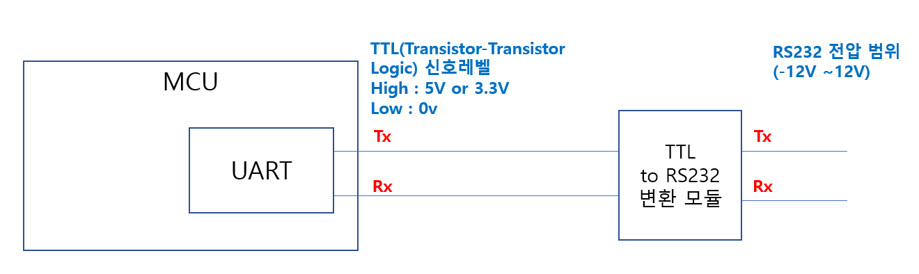 그리고 Tx라인을 통해서 위와 같은 0~3.3V 또는 0~5V 전압레벨로 정보를 전달하고, Rx 라인을 통해 동일한 전압레벨로 정보를 전달 받는다.