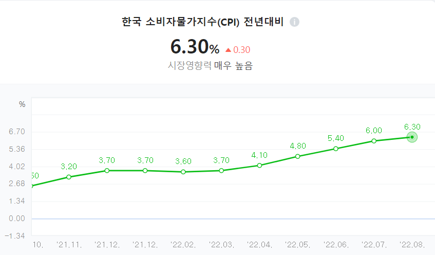 그렇기 때문에 미국 연준의 금리인상이 바로 이루어지지는 않을 것 같습니다.현재 우리나라의 CPI는 어떻게 될까요?한국의 8월 CPI는 6.3%입니다.