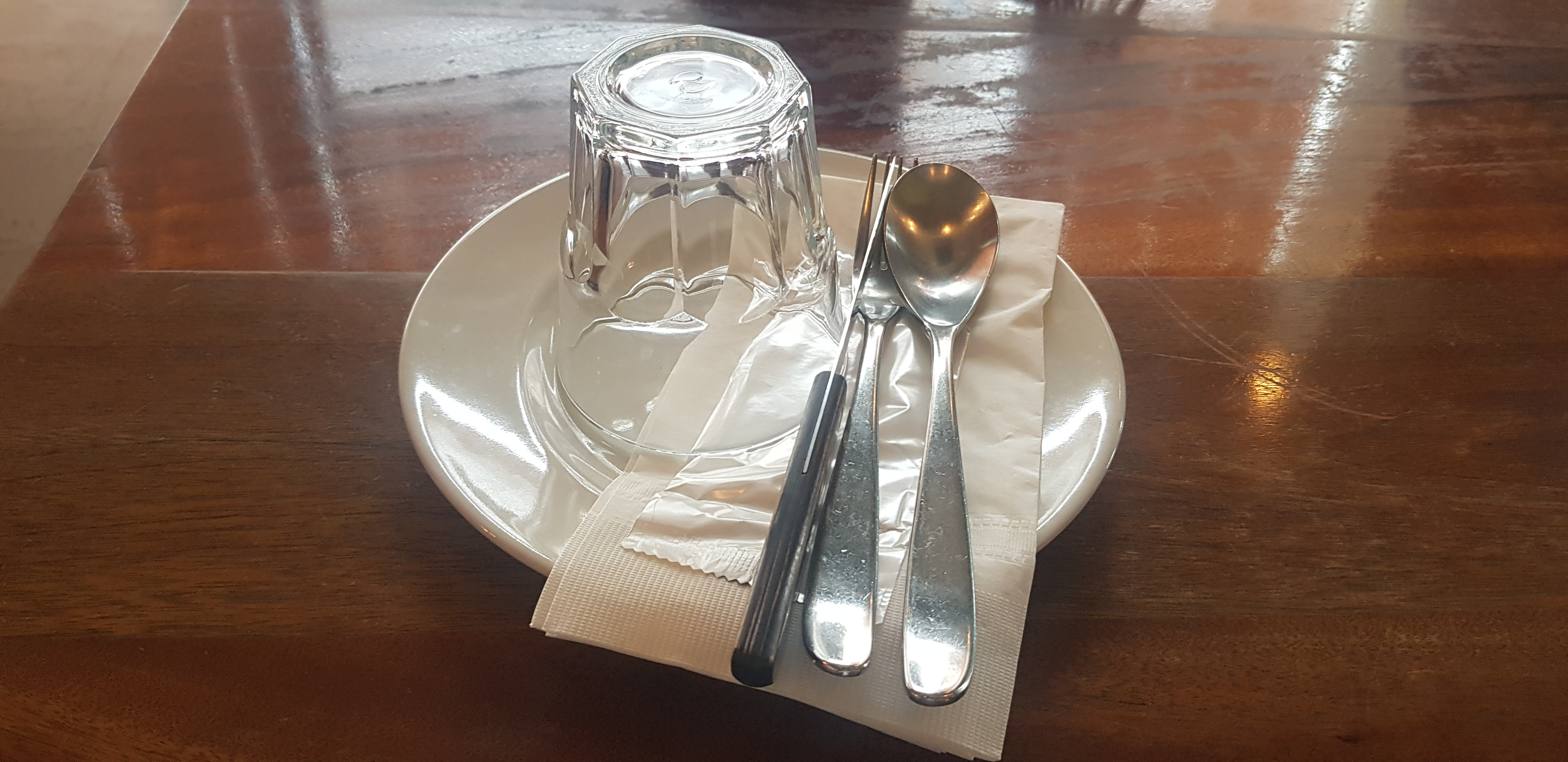 컵과 나이프,포크, 숟가락이 놓여져 있습니다.
