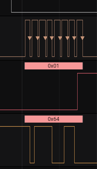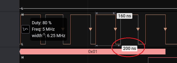 하나의 비트를 보낼때 주기가 200ns인것을 확인할수 있습니다.