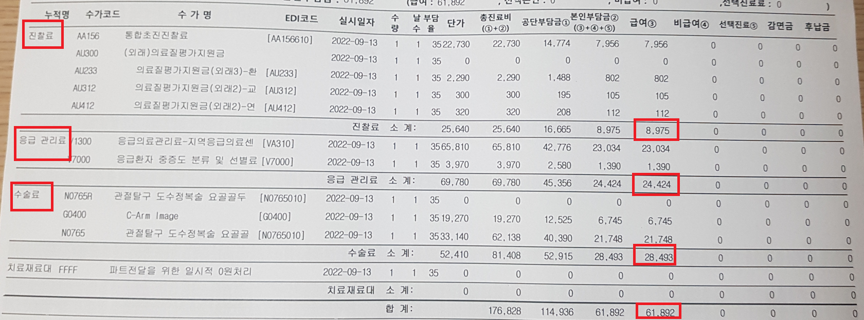 진찰료 + 응급 관리료 +수술료 = 61,892원
