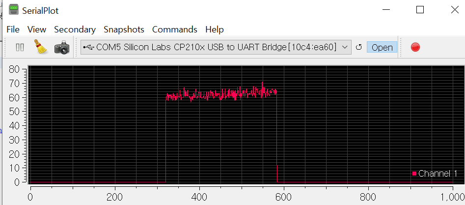 이에 다하여 모터가 동작하고 모터에 연결된 엔코더(Encoder)를 통하여 측정된 Pulse 그래프는 아래와 같다.