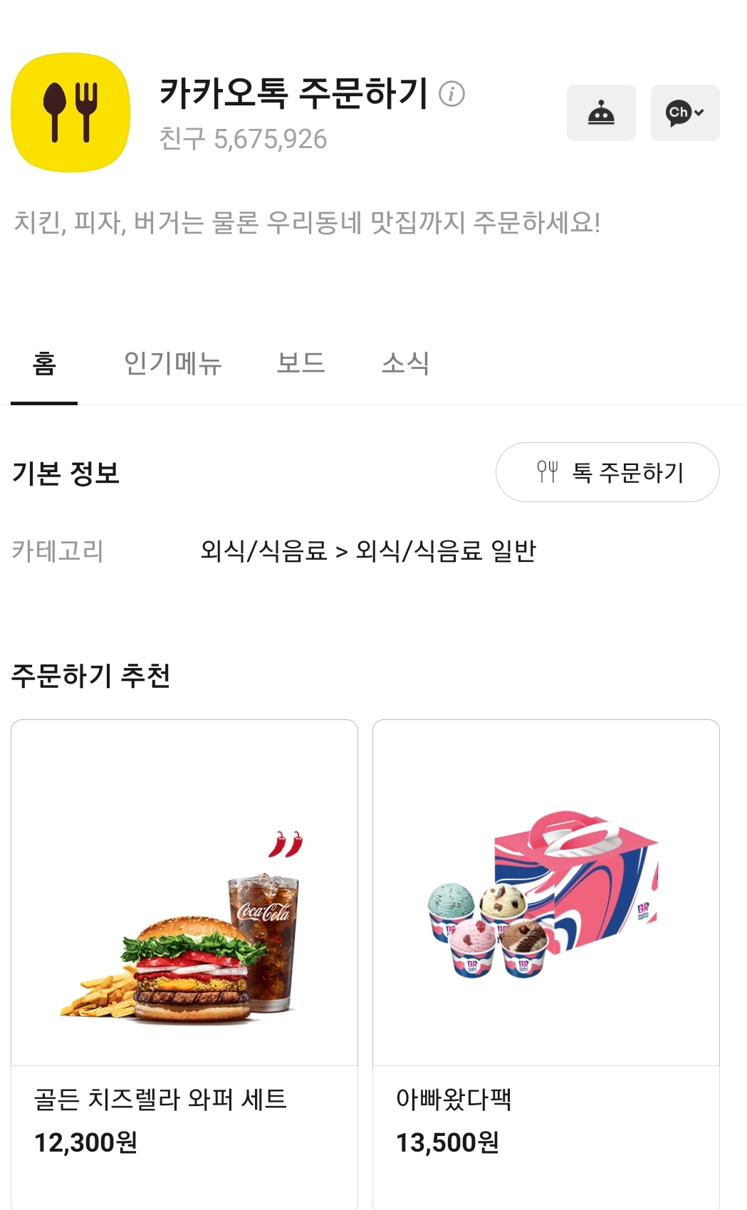 말그대로 카카오톡을 이용하여 간편하게 배달 음식을 주문하는 기능입니다.
