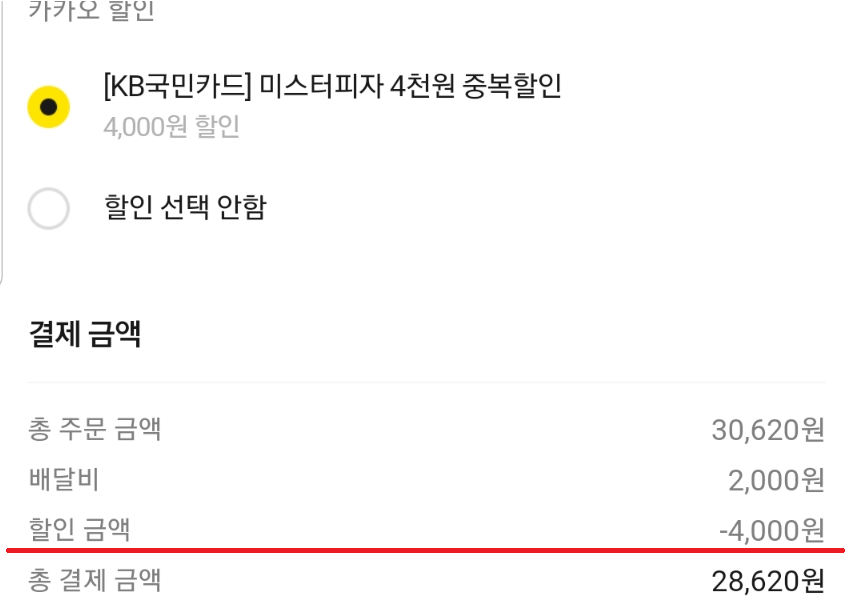 위에서 할인 금액이 적용되어 28,620원에 미스터피자를 시켜 먹을 수 있는것을 확인 할 수 있습니다.