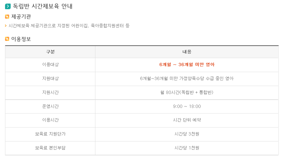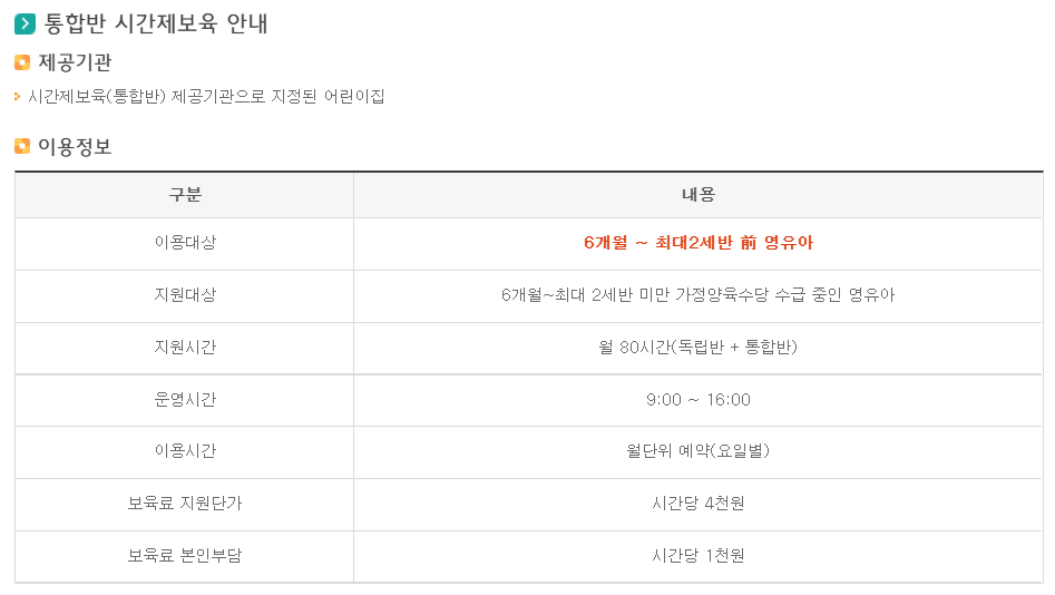 그러면 시간제보육안내가 아래와 같이 나오게 됩니다.