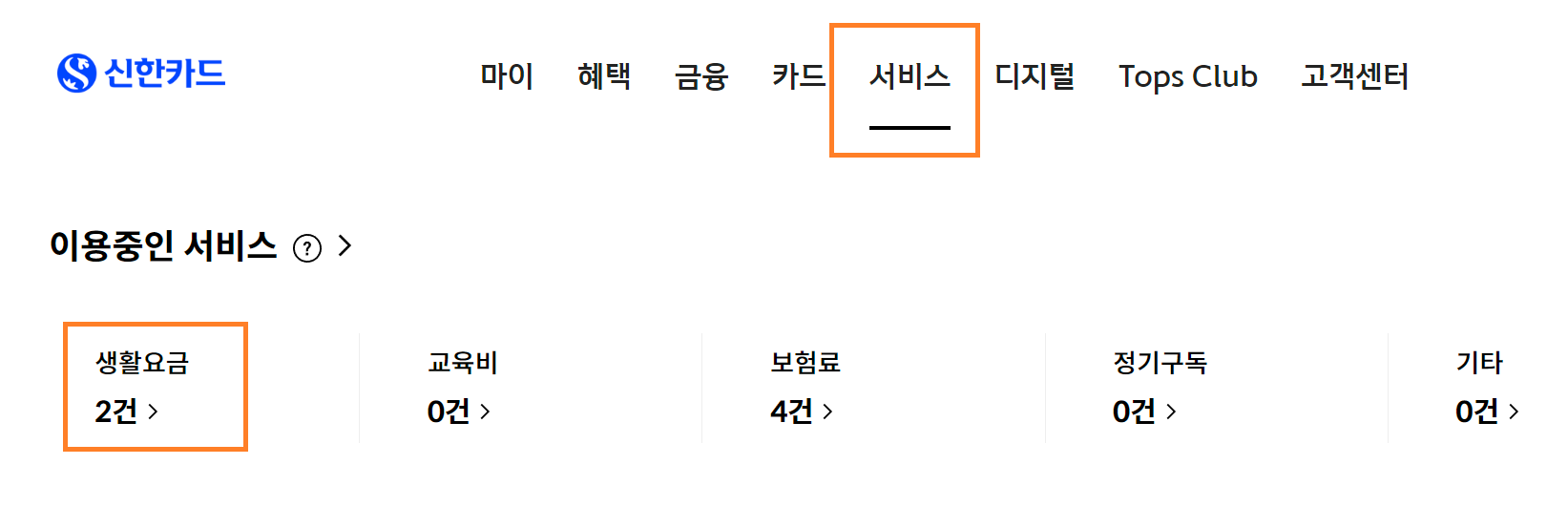 서비스를 누르시면 아래와 같이 정기적으로 납부하고 있는 항목을 확인하실 수 있습니다.