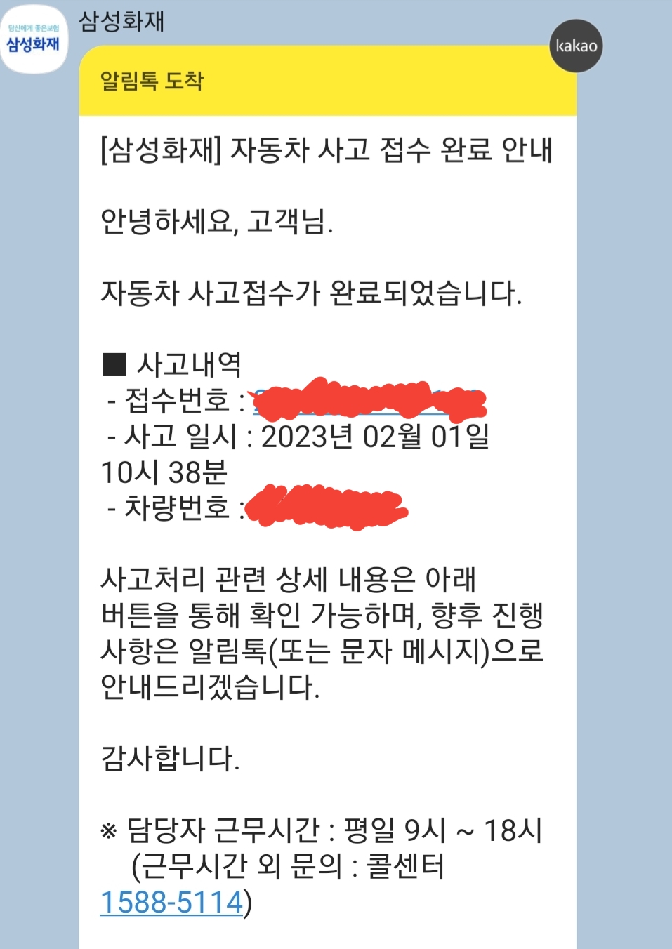 저는 아래와 같이 자동차 사고 접수가 완료되었다는
