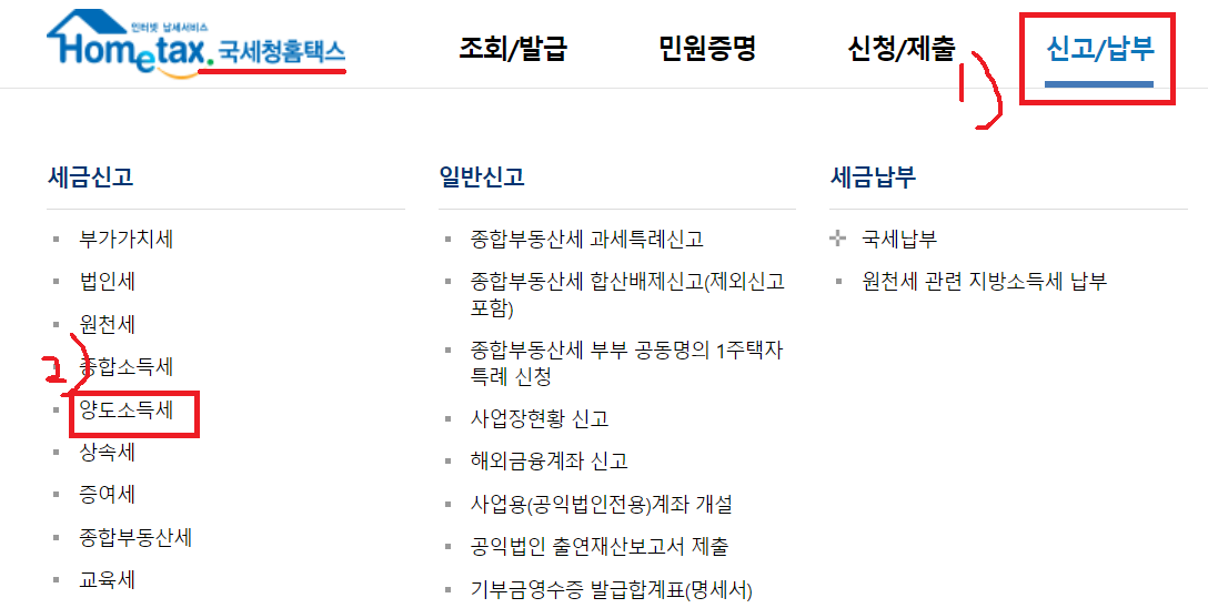 그리고 신고/납부를 선택하시고 양도소득세를 선택해 주시기를 바랍니다.
