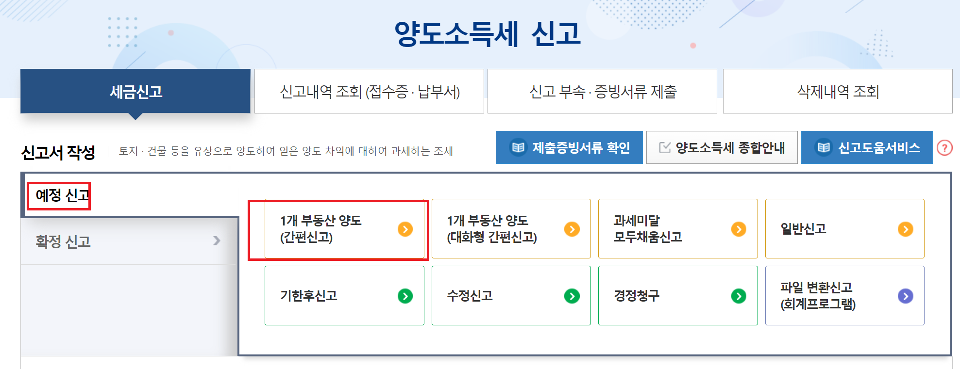 아래와 같이 1개 부동산 양도 간편신고를 선택해 주세요.