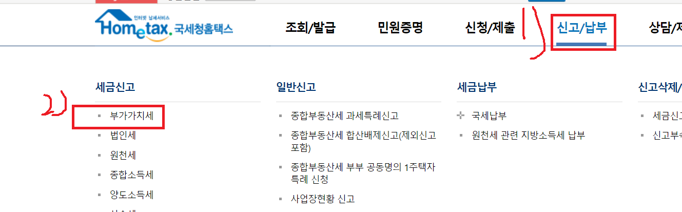 먼저 '신고/납부'에서 '부가가치세'를 선택해 주시기 바랍니다.