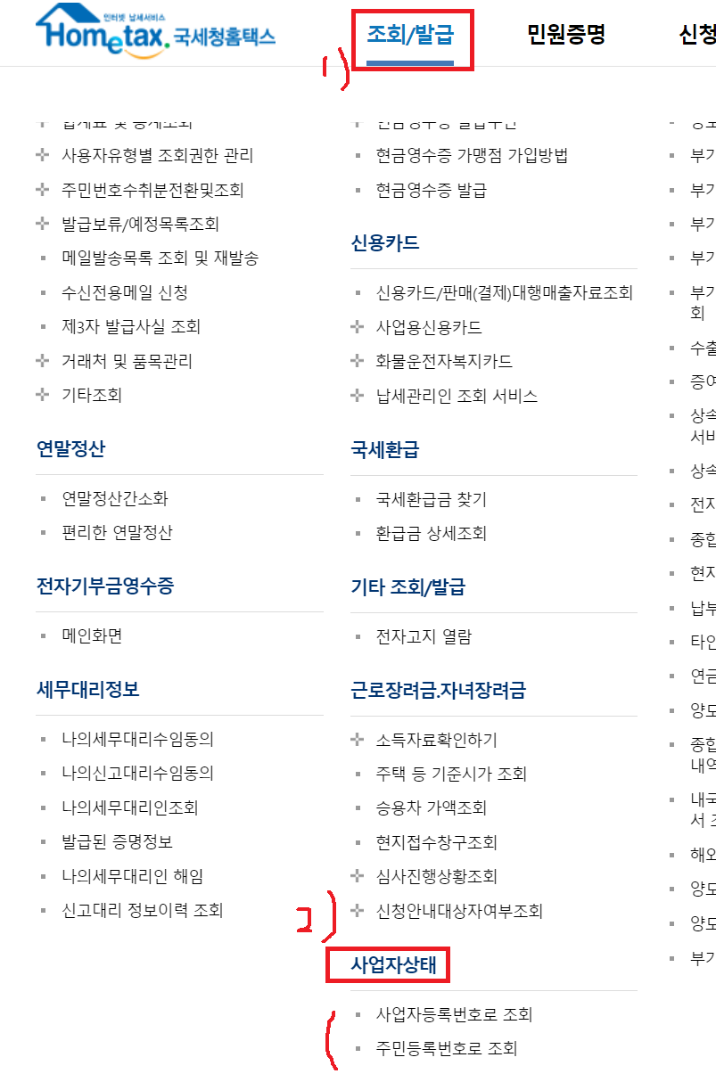 그러면 아래와 같이 '조회/발급'을 선택하심변 아래에 '사업자상태'를 확인 하실 수 있습니다.