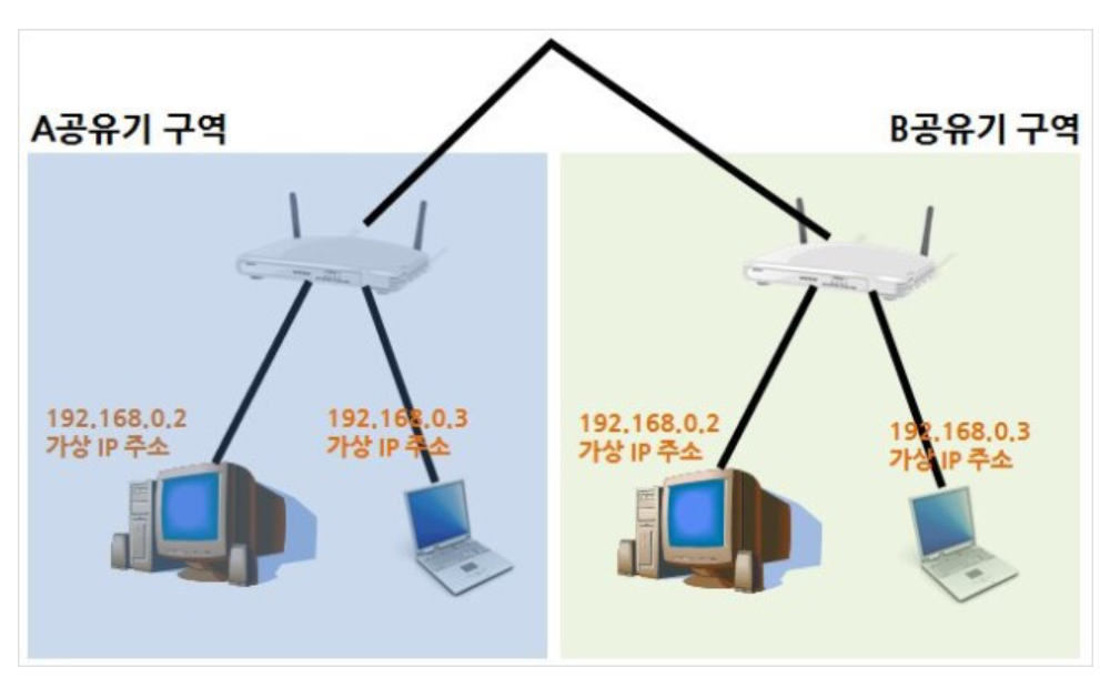 그리고 이 공유기에 무선뿐만 아니라 다양한 유선라인도 가상 IP주소를 할당하여