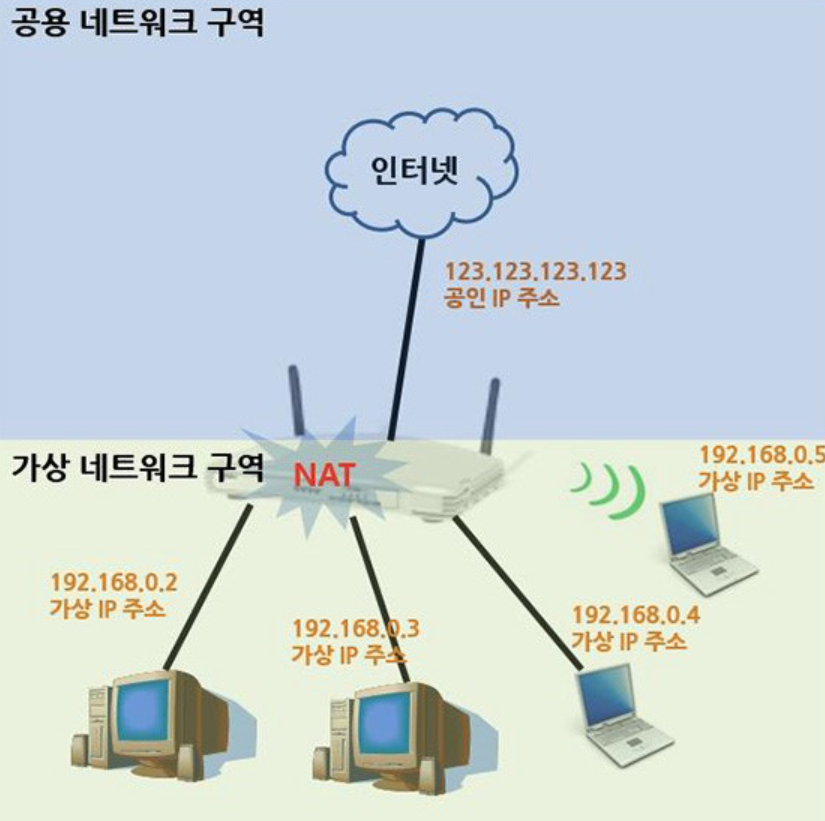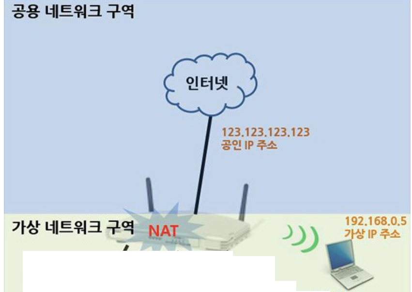 공유기는 공인IP주소를 가상IP주소를 변환해 주는 역할을 수행합니다.