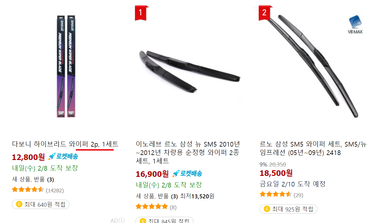 쿠팡에서 찾아보니 와이퍼가 1세트 (운전석, 조수석 전부) 해서 12,800원 하는 것을 볼 수 있습니다.