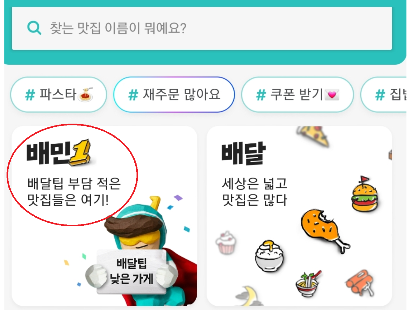 우선 배달의민족 어플을 실행시키면 아래와 같이 '배민1' 이라는 창이 보입니다.