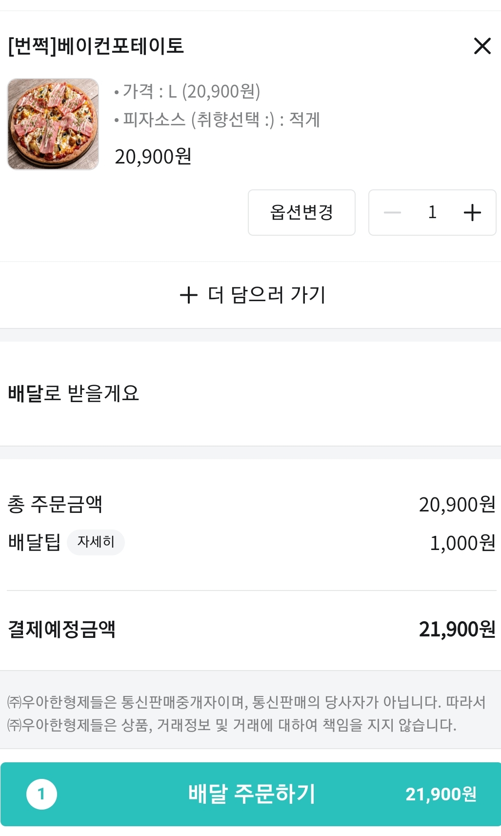 따라서 배민1에서 번쩍피자를 시켰습니다.