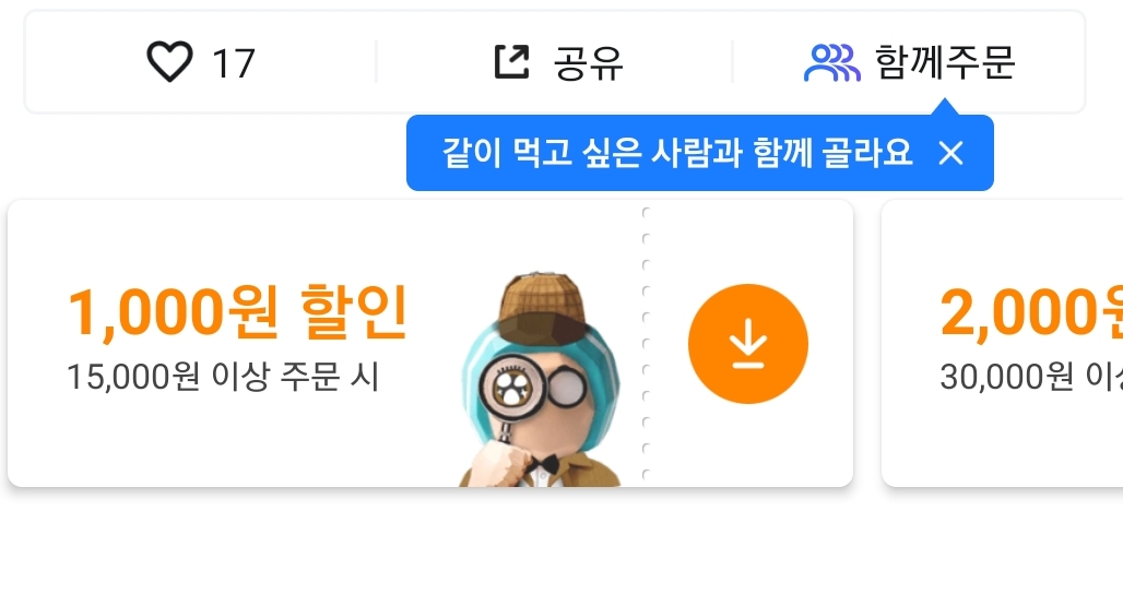 아래와 같이 15,000원 시키면 1,000원 할인이라고 합니다.