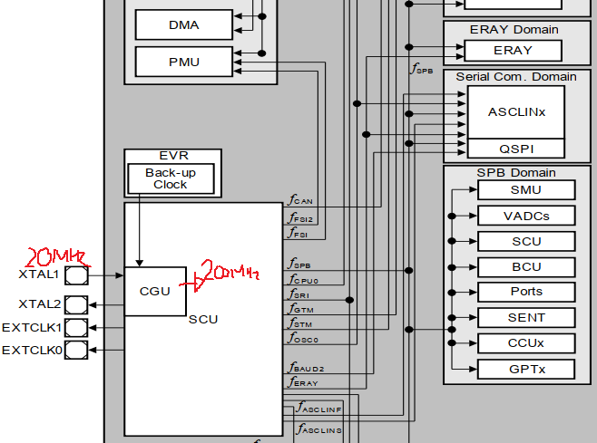 20MHz (External OSC) -> 200MHz through PLL -> Connect this to be used by CPU, and divide 200MHz appropriately into clocks that can be used by peripheral devices and distribute them