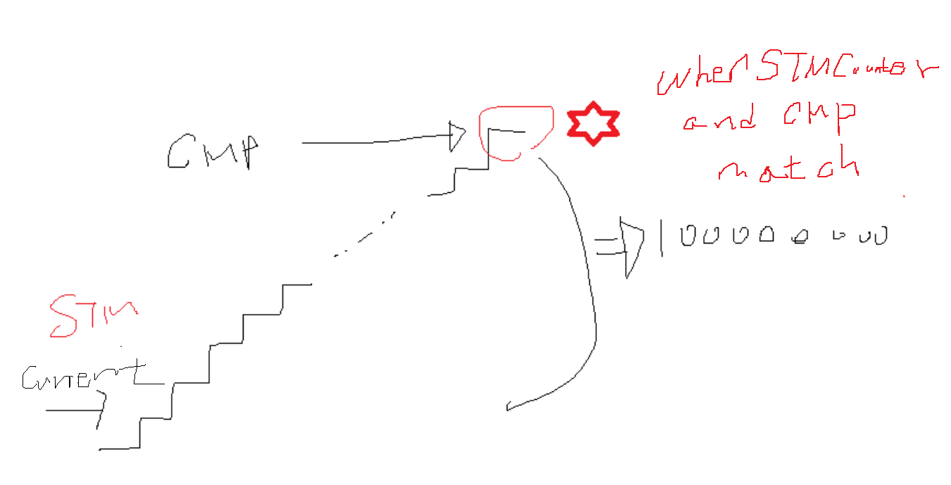 The picture is a bit messy, but when the STM Coutner matches the counter written in the CMP, an interrupt will occur.